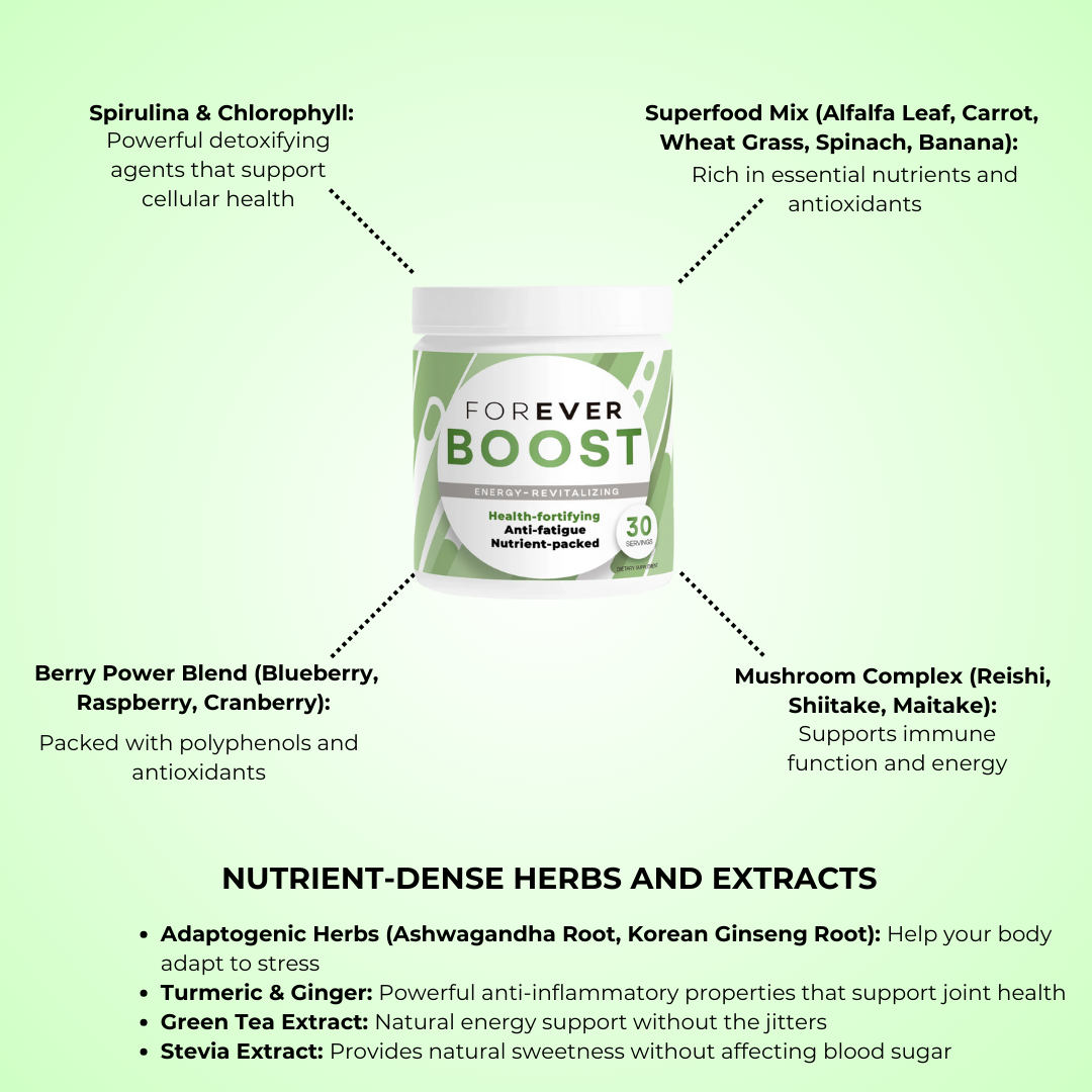 FOREVER BOOST contains a small amount of naturally occurring caffeine from green tea extract, but significantly less than a cup of coffee. The energy you feel comes primarily from nutrient-dense superfoods, adaptogens, and improved cellular function rather than stimulants.