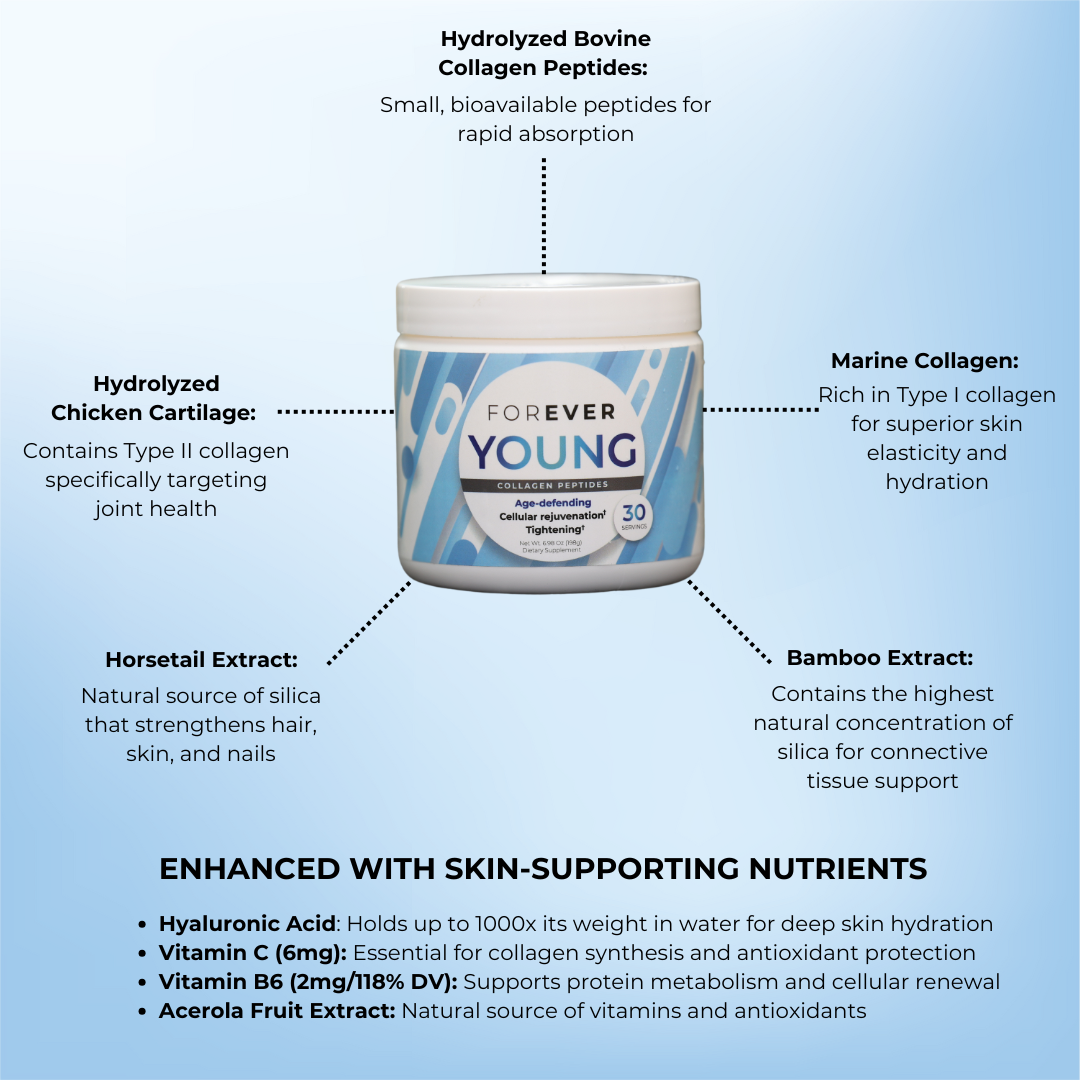 Developed by our team of nutrition scientists and dermatologists, FOREVER YOUNG's formula is precisely calibrated for optimal bioavailability and results. Each ingredient is included at therapeutic dosages backed by clinical research.