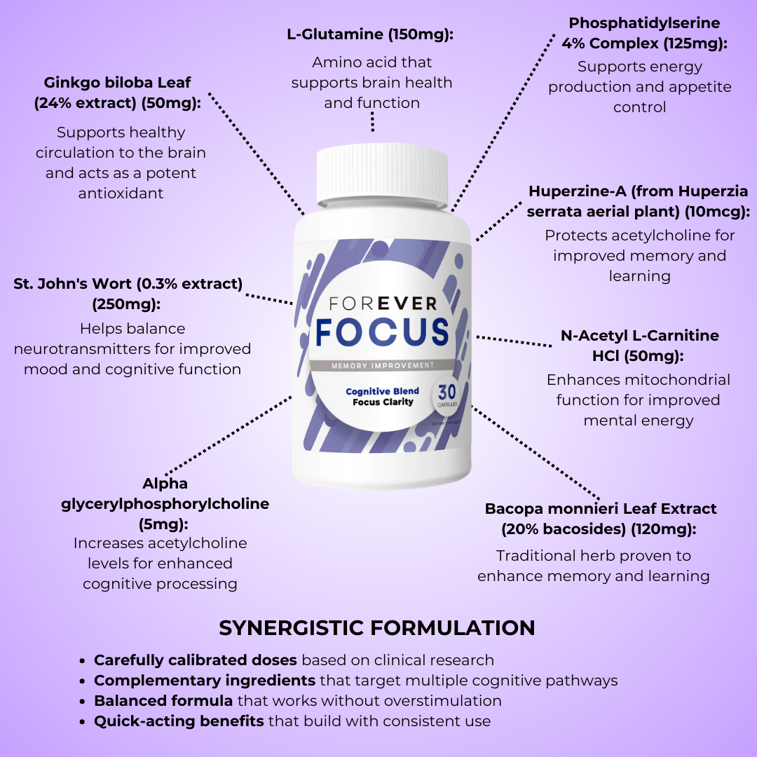 Developed by our team of neuropharmacologists and cognitive health specialists, FOREVER FOCUS combines traditional cognitive enhancers with cutting-edge nootropic compounds. Each ingredient is included at research-supported dosages for optimal effectiveness.